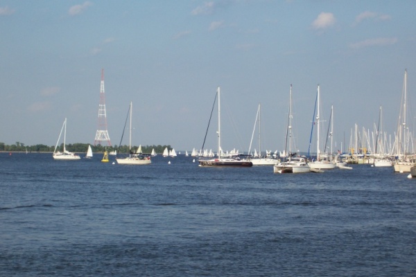 In the evening we met the returning Schooner Woodwind (which docks at the Annapolis Marriott) and asked the captain if we could see below to decide if we would like to do their "Boat and Breakfast". He seemed a little taken aback, but was gracious and gave Diane a quick tour. I was most concerned about how she would handle the cramped quarters down below. Although she thought it would be fine for the night, I thought she really wouldn't enjoy it and that we should consider an alternative. We ran up and changed for dinner and then decided to simply eat at Pussers again. It was our (early) anniversary dinner so we did it up with me having crab cakes and she fillet mignon.